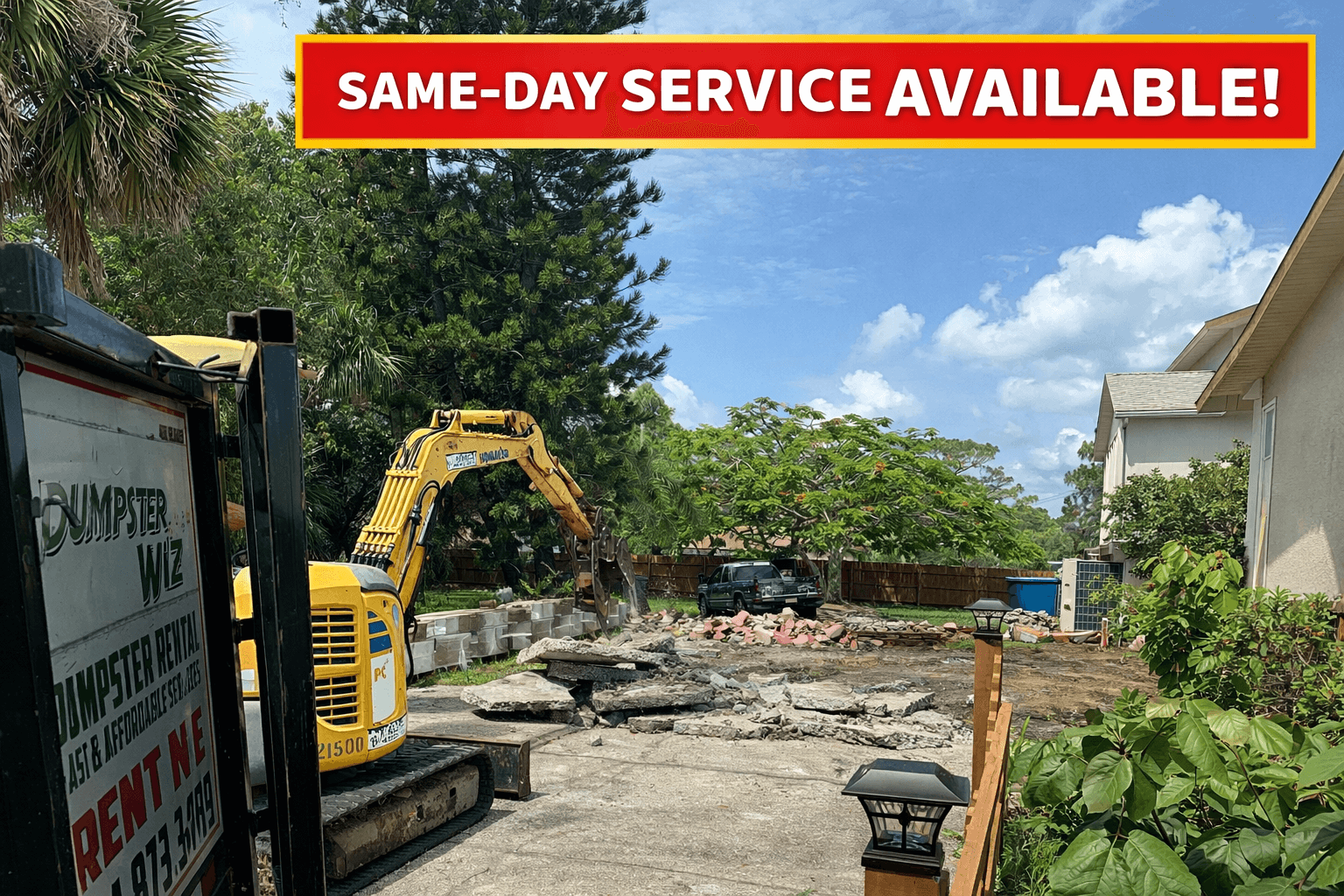 Dumpster Wiz offers same-day pickup, depending on availability.